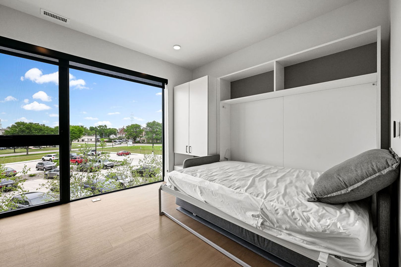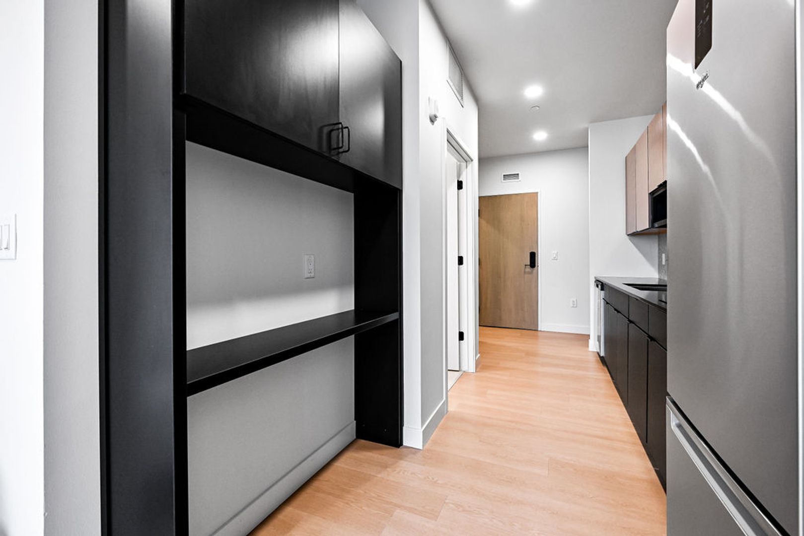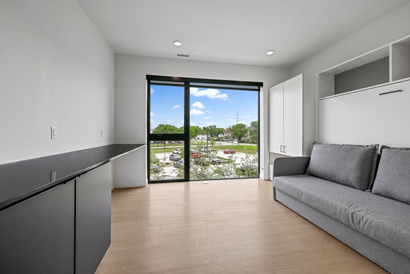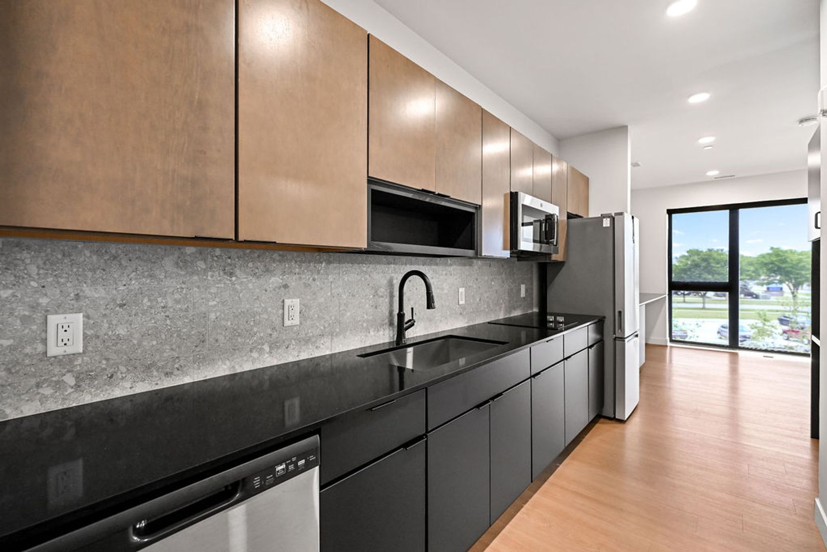 This is a studio unit in Mackson Corners, a 4-story residential development located at 417 Marion Road in Oshkosh, WI, directly on the Fox River. The building includes 74 residential units of various sizes, including furnished and unfurnished studios, one-bedroom units, and two-bedroom units. Features like the river-facing fitness center and walk-up residential units connect the building to the surrounding neighborhood, encouraging pedestrians to flow through the site to the river. There is also ample space for gathering on site including a first-floor lounge & rooftop terrace. The building has both underground, heated parking and surface parking.