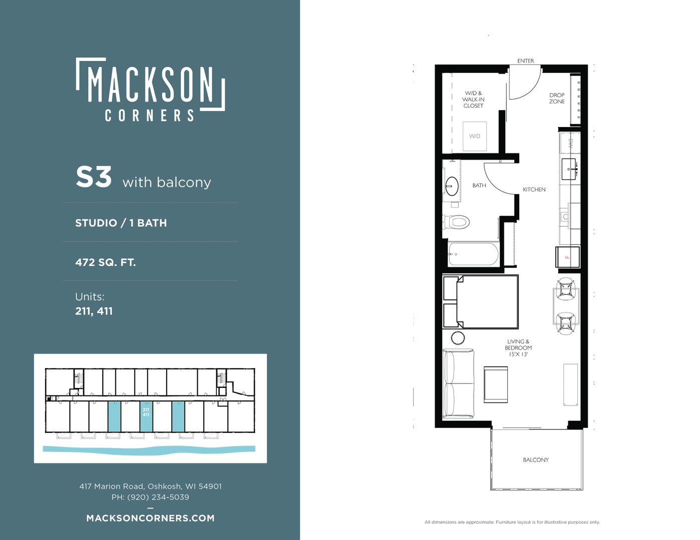 This is a studio unit in Mackson Corners, a 4-story residential development located at 417 Marion Road in Oshkosh, WI, directly on the Fox River. The building includes 74 residential units of various sizes, including furnished and unfurnished studios, one-bedroom units, and two-bedroom units. Features like the river-facing fitness center and walk-up residential units connect the building to the surrounding neighborhood, encouraging pedestrians to flow through the site to the river. There is also ample space for gathering on site including a first-floor lounge & rooftop terrace. The building has both underground, heated parking and surface parking.
