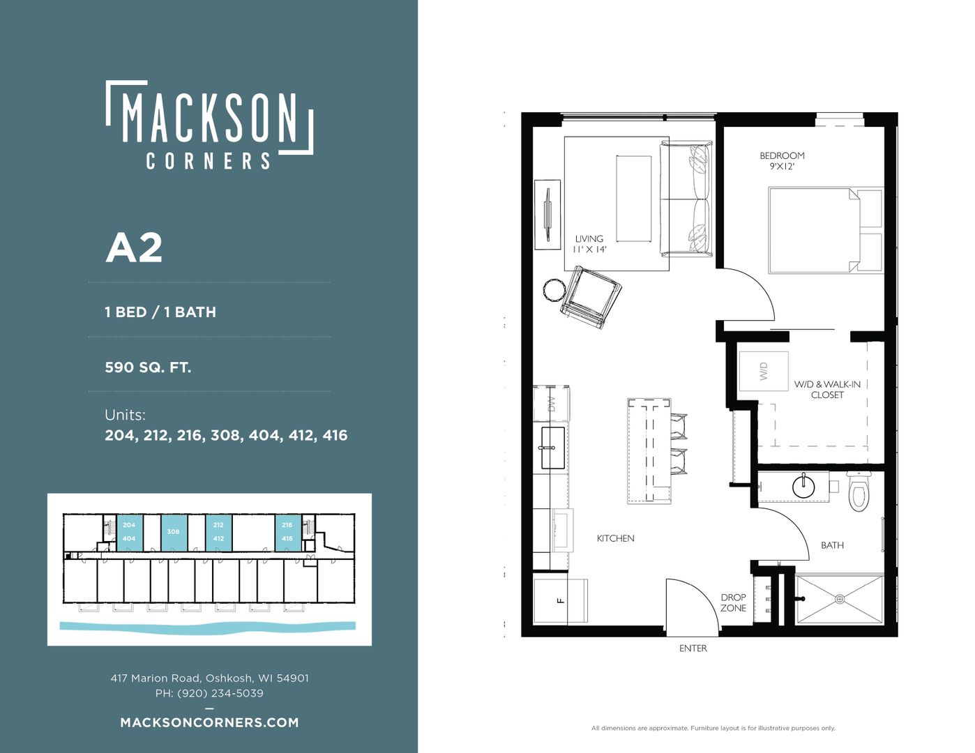 This is a 1 bedroom, 1 bathroom unit in Mackson Corners, a 4-story residential development located at 417 Marion Road in Oshkosh, WI, directly on the Fox River. The building includes 74 residential units of various sizes, including furnished and unfurnished studios, one-bedroom units, and two-bedroom units. Features like the river-facing fitness center and walk-up residential units connect the building to the surrounding neighborhood, encouraging pedestrians to flow through the site to the river. There is also ample space for gathering on site including a first-floor lounge & rooftop terrace. The building has both underground, heated parking and surface parking.