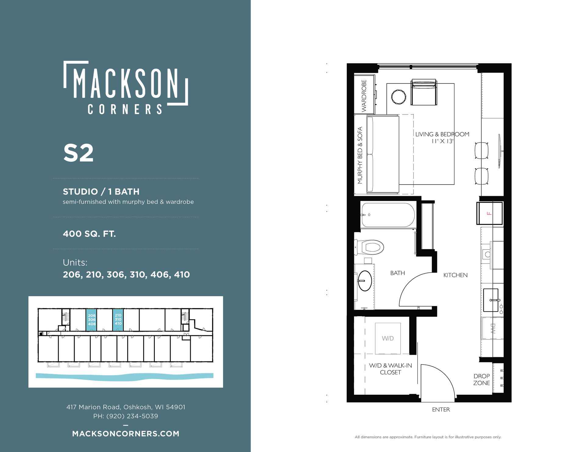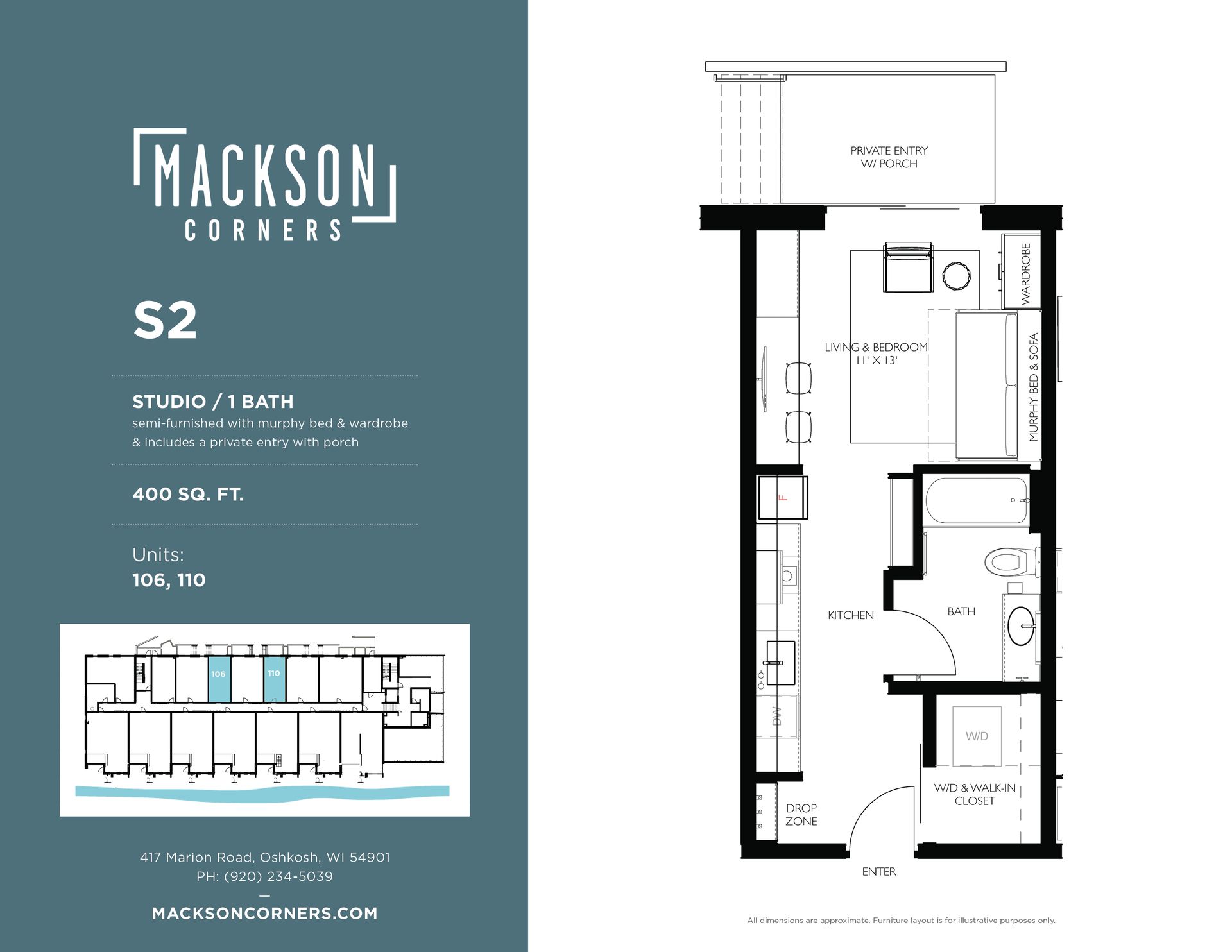 This is a studio unit in Mackson Corners, a 4-story residential development located at 417 Marion Road in Oshkosh, WI, directly on the Fox River. The building includes 74 residential units of various sizes, including furnished and unfurnished studios, one-bedroom units, and two-bedroom units. Features like the river-facing fitness center and walk-up residential units connect the building to the surrounding neighborhood, encouraging pedestrians to flow through the site to the river. There is also ample space for gathering on site including a first-floor lounge & rooftop terrace. The building has both underground, heated parking and surface parking.