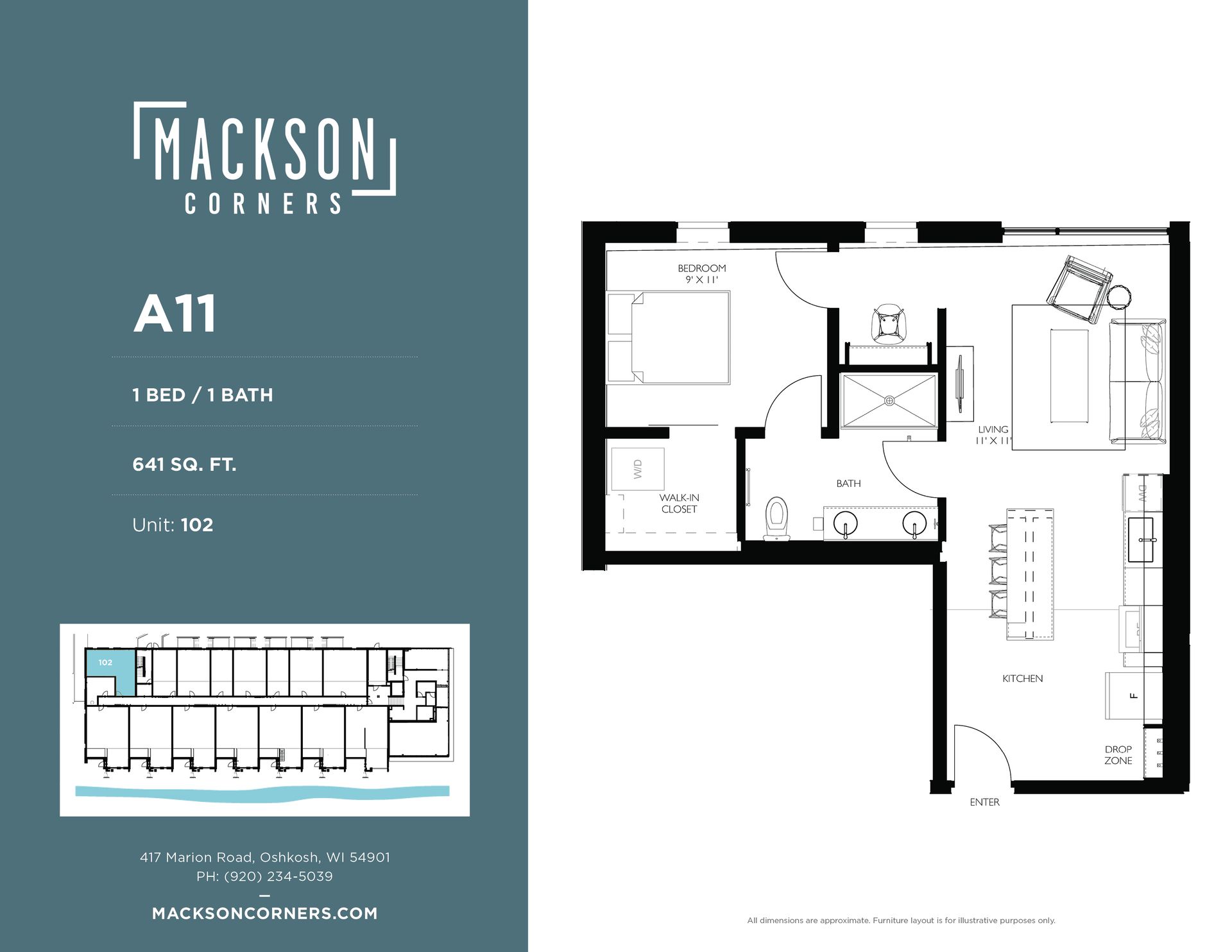 This is 1 bedroom, 1 bathroom unit in Mackson Corners, a 4-story residential development located at 417 Marion Road in Oshkosh, WI, directly on the Fox River. The building includes 74 residential units of various sizes, including furnished and unfurnished studios, one-bedroom units, and two-bedroom units. Features like the river-facing fitness center and walk-up residential units connect the building to the surrounding neighborhood, encouraging pedestrians to flow through the site to the river. There is also ample space for gathering on site including a first-floor lounge & rooftop terrace. The building has both underground, heated parking and surface parking.