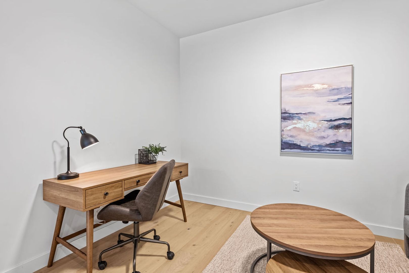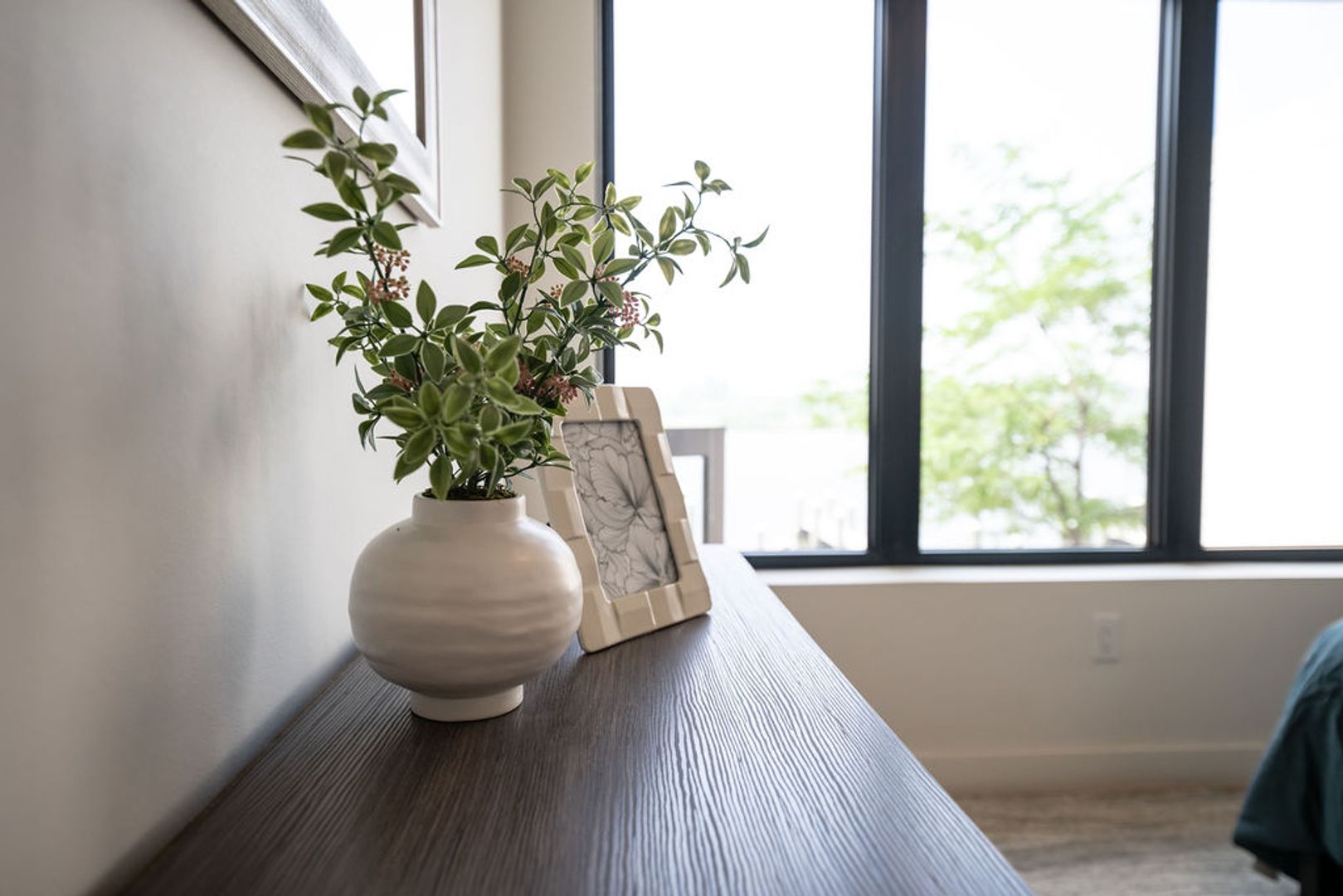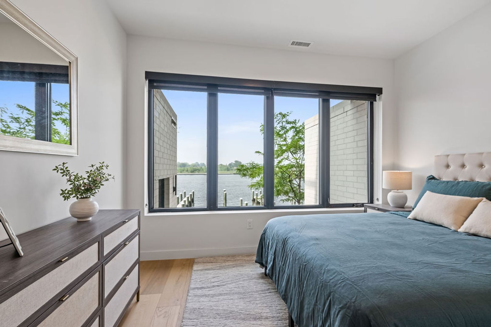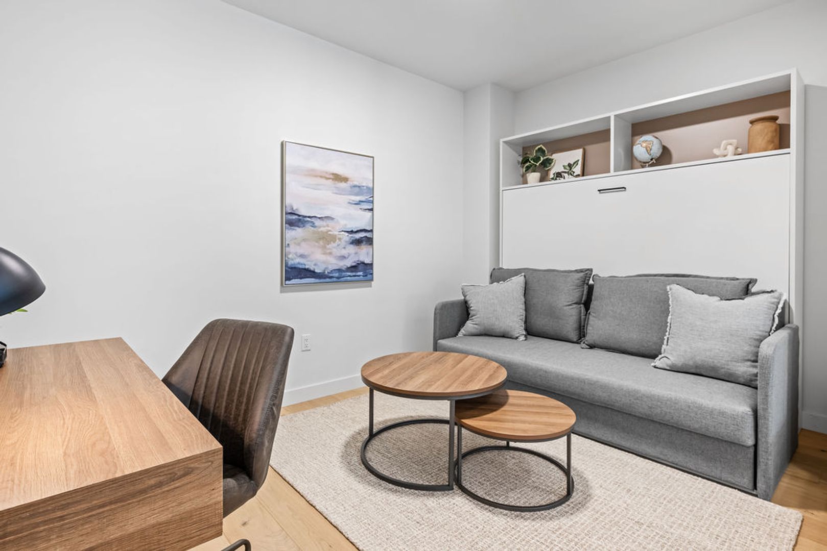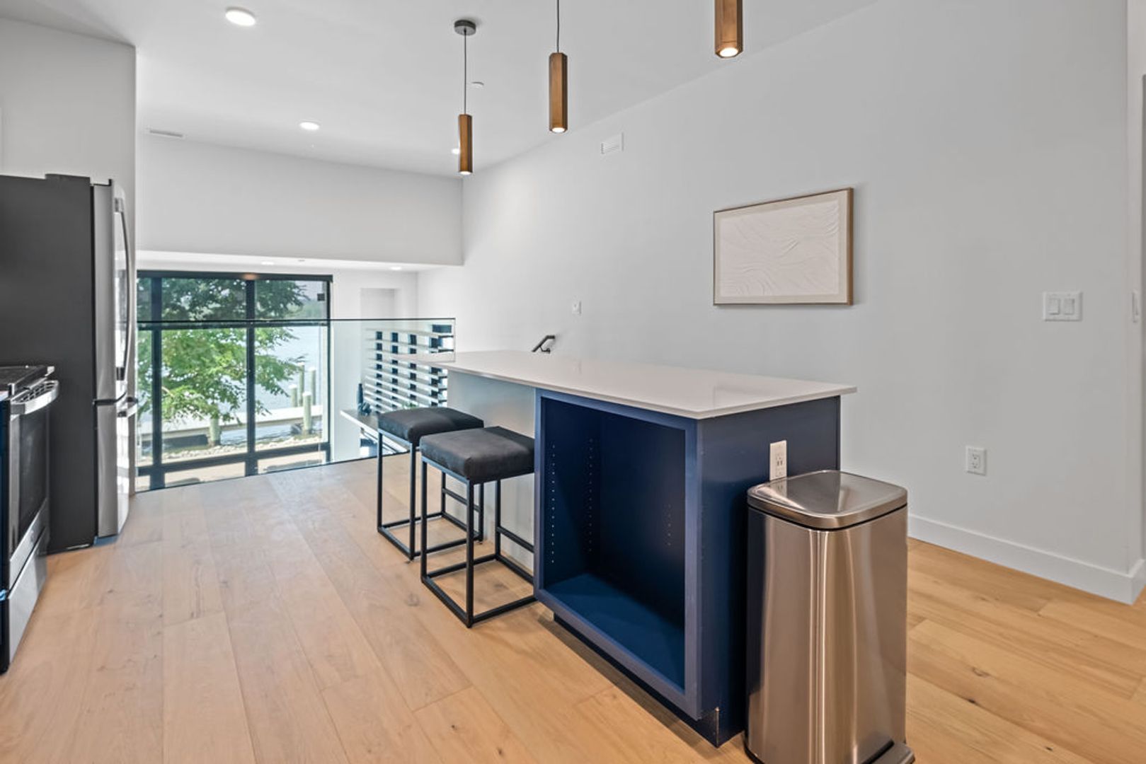 This is a 1 bedroom + den, 1.5 bathroom unit in Mackson Corners, a 4-story residential development located at 417 Marion Road in Oshkosh, WI, directly on the Fox River. The building includes 74 residential units of various sizes, including furnished and unfurnished studios, one-bedroom units, and two-bedroom units. Features like the river-facing fitness center and walk-up residential units connect the building to the surrounding neighborhood, encouraging pedestrians to flow through the site to the river. There is also ample space for gathering on site including a first-floor lounge & rooftop terrace. The building has both underground, heated parking and surface parking.
