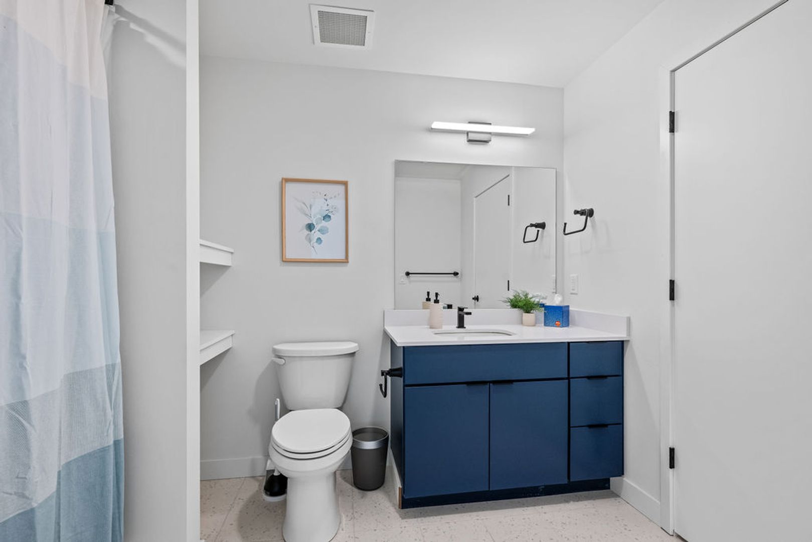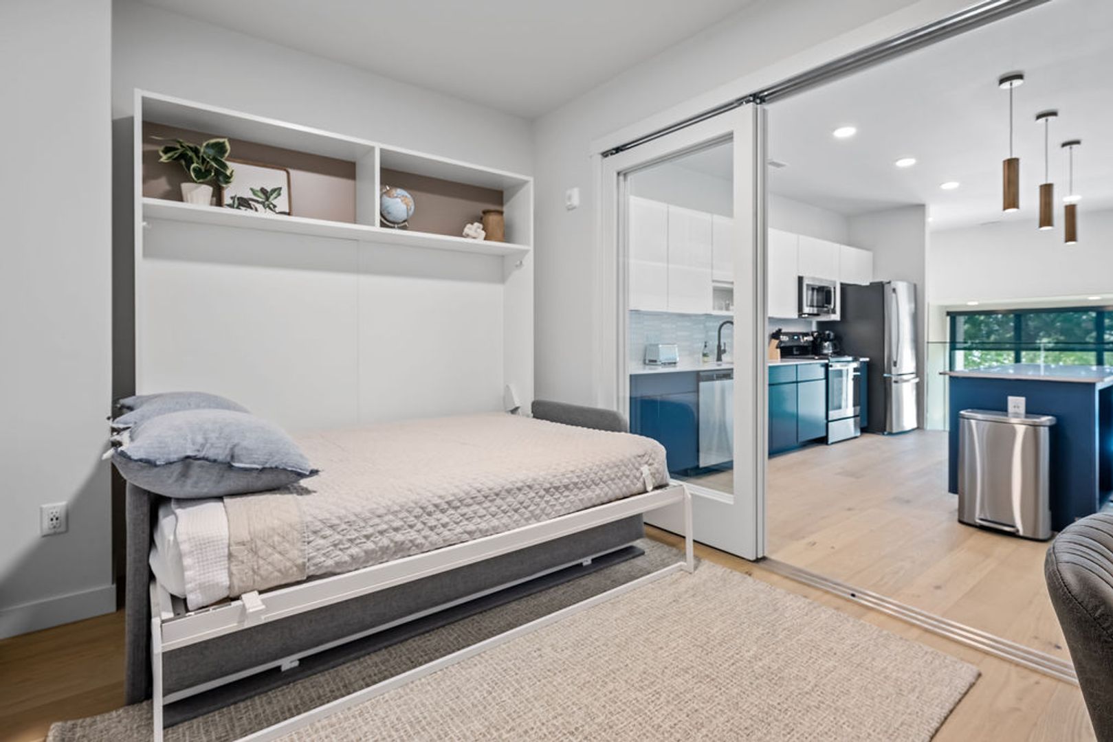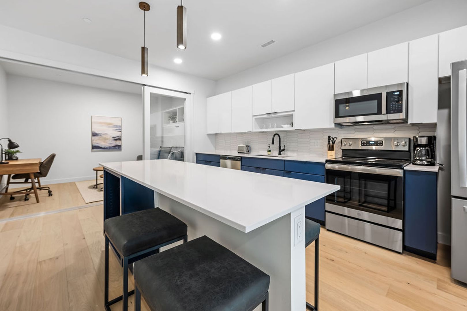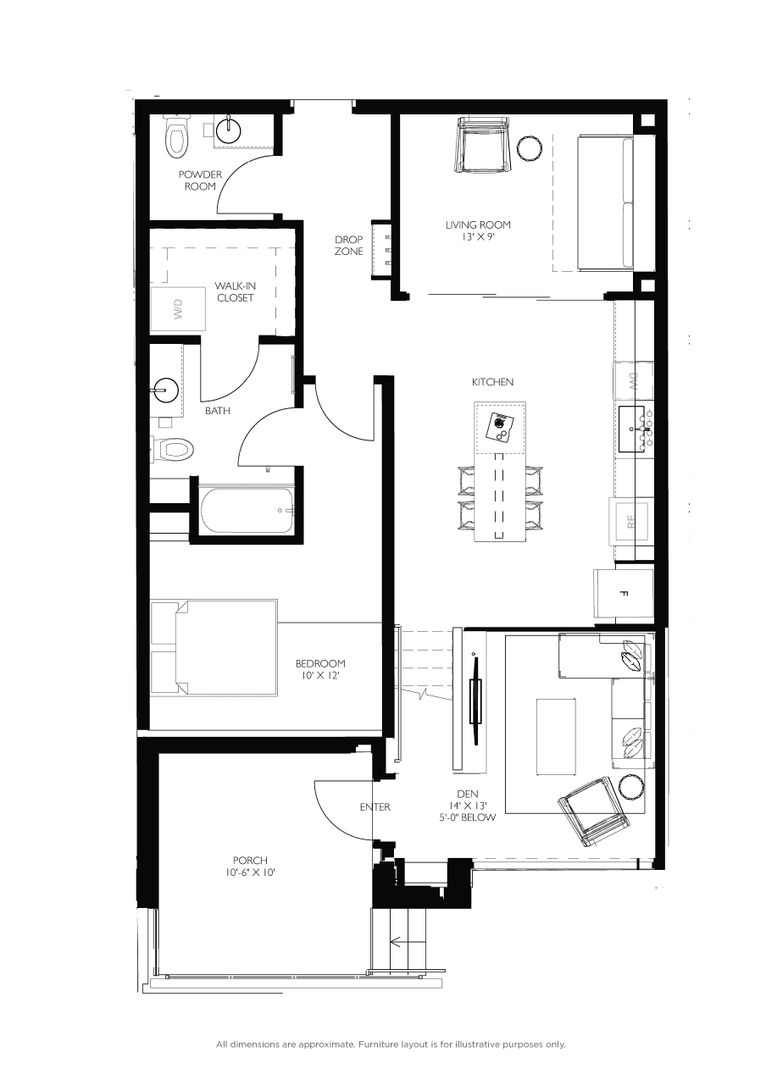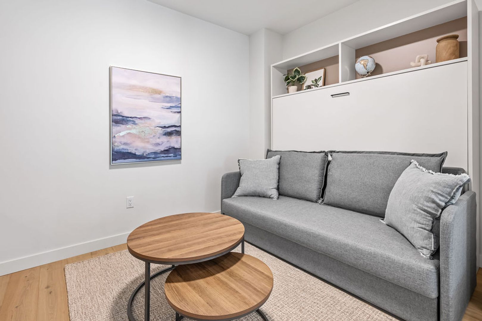 This is a 1 bedroom + den, 1.5 bathroom unit in Mackson Corners, a 4-story residential development located at 417 Marion Road in Oshkosh, WI, directly on the Fox River. The building includes 74 residential units of various sizes, including furnished and unfurnished studios, one-bedroom units, and two-bedroom units. Features like the river-facing fitness center and walk-up residential units connect the building to the surrounding neighborhood, encouraging pedestrians to flow through the site to the river. There is also ample space for gathering on site including a first-floor lounge & rooftop terrace. The building has both underground, heated parking and surface parking.