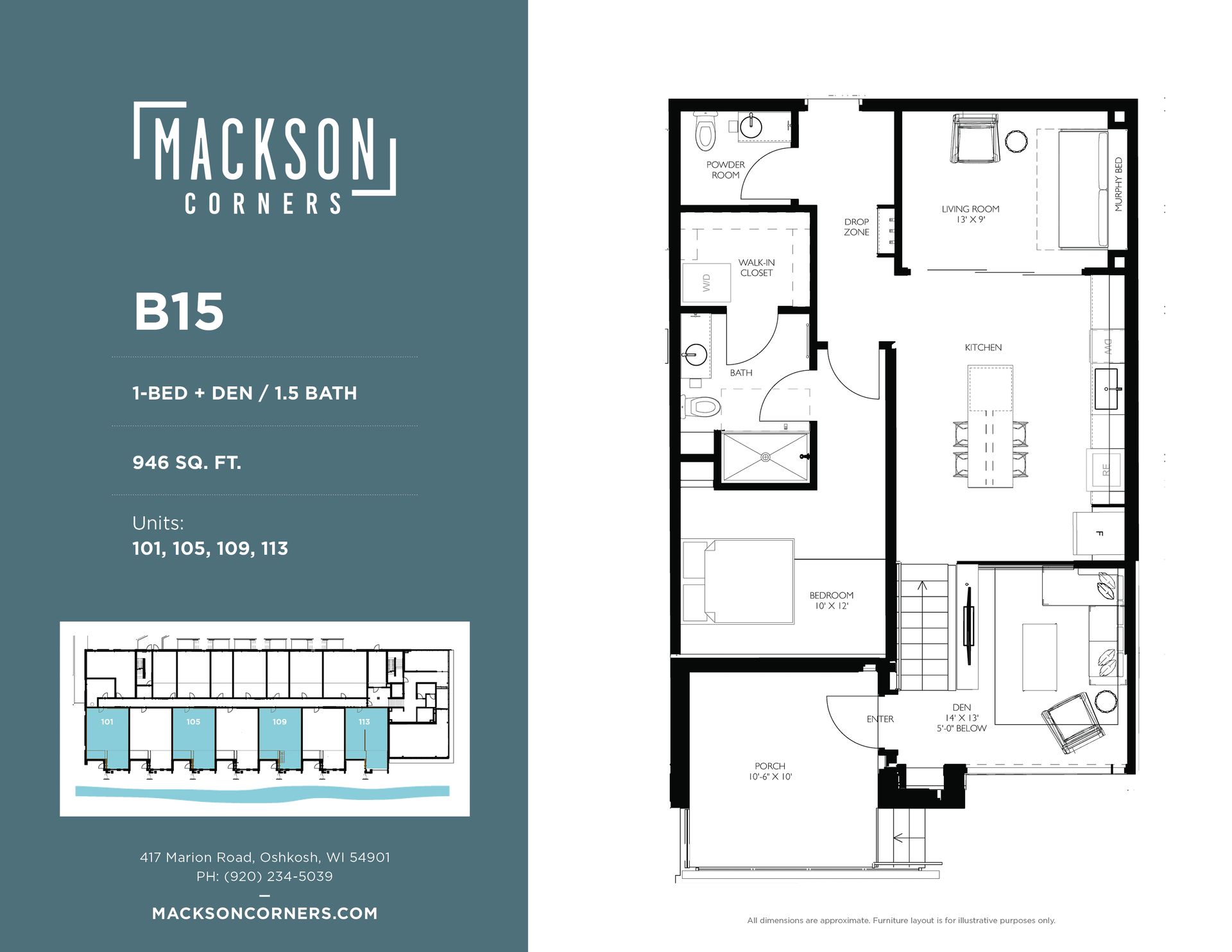 This is a 1 bedroom + den, 1.5 bathroom unit in Mackson Corners, a 4-story residential development located at 417 Marion Road in Oshkosh, WI, directly on the Fox River. The building includes 74 residential units of various sizes, including furnished and unfurnished studios, one-bedroom units, and two-bedroom units. Features like the river-facing fitness center and walk-up residential units connect the building to the surrounding neighborhood, encouraging pedestrians to flow through the site to the river. There is also ample space for gathering on site including a first-floor lounge & rooftop terrace. The building has both underground, heated parking and surface parking.