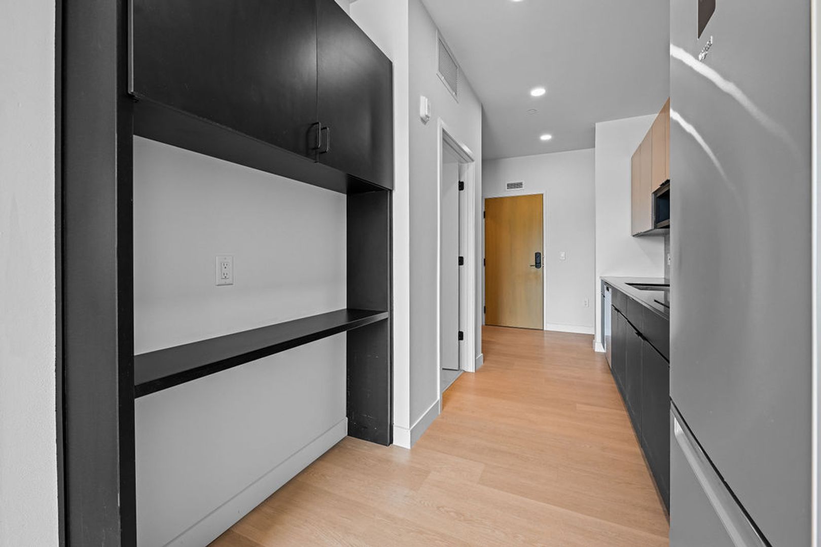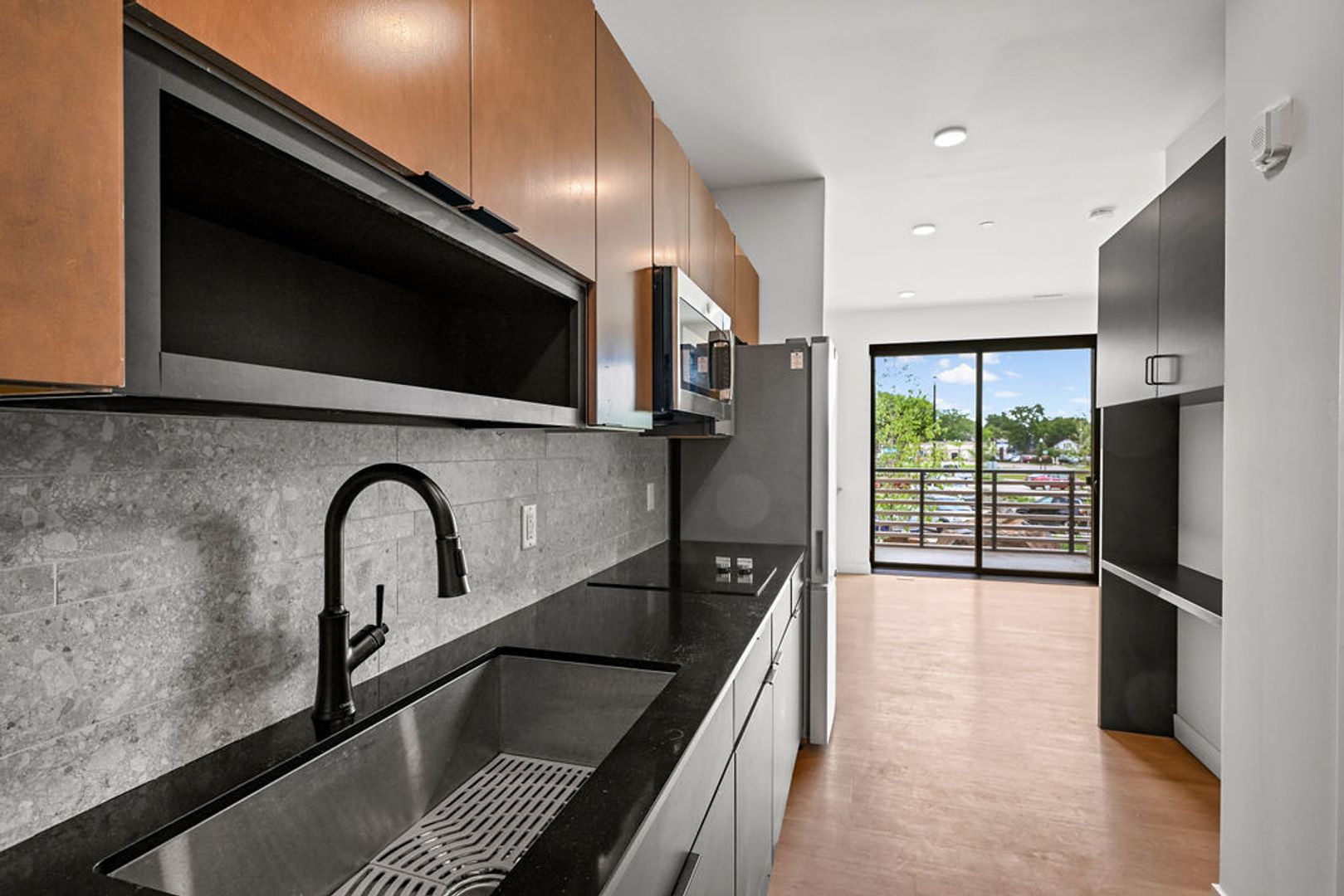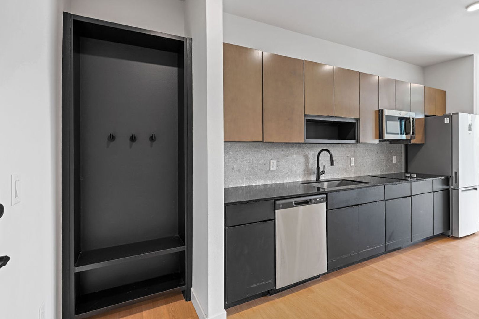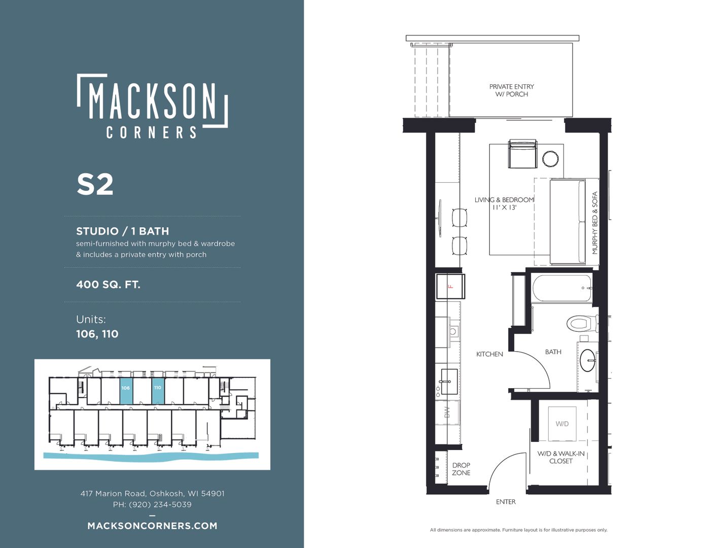 This is a studio unit in Mackson Corners, a 4-story residential development located at 417 Marion Road in Oshkosh, WI, directly on the Fox River. The building includes 74 residential units of various sizes, including furnished and unfurnished studios, one-bedroom units, and two-bedroom units. Features like the river-facing fitness center and walk-up residential units connect the building to the surrounding neighborhood, encouraging pedestrians to flow through the site to the river. There is also ample space for gathering on site including a first-floor lounge & rooftop terrace. The building has both underground, heated parking and surface parking.