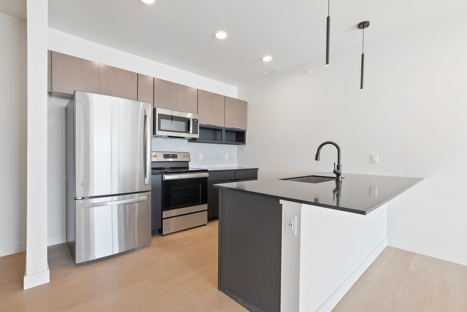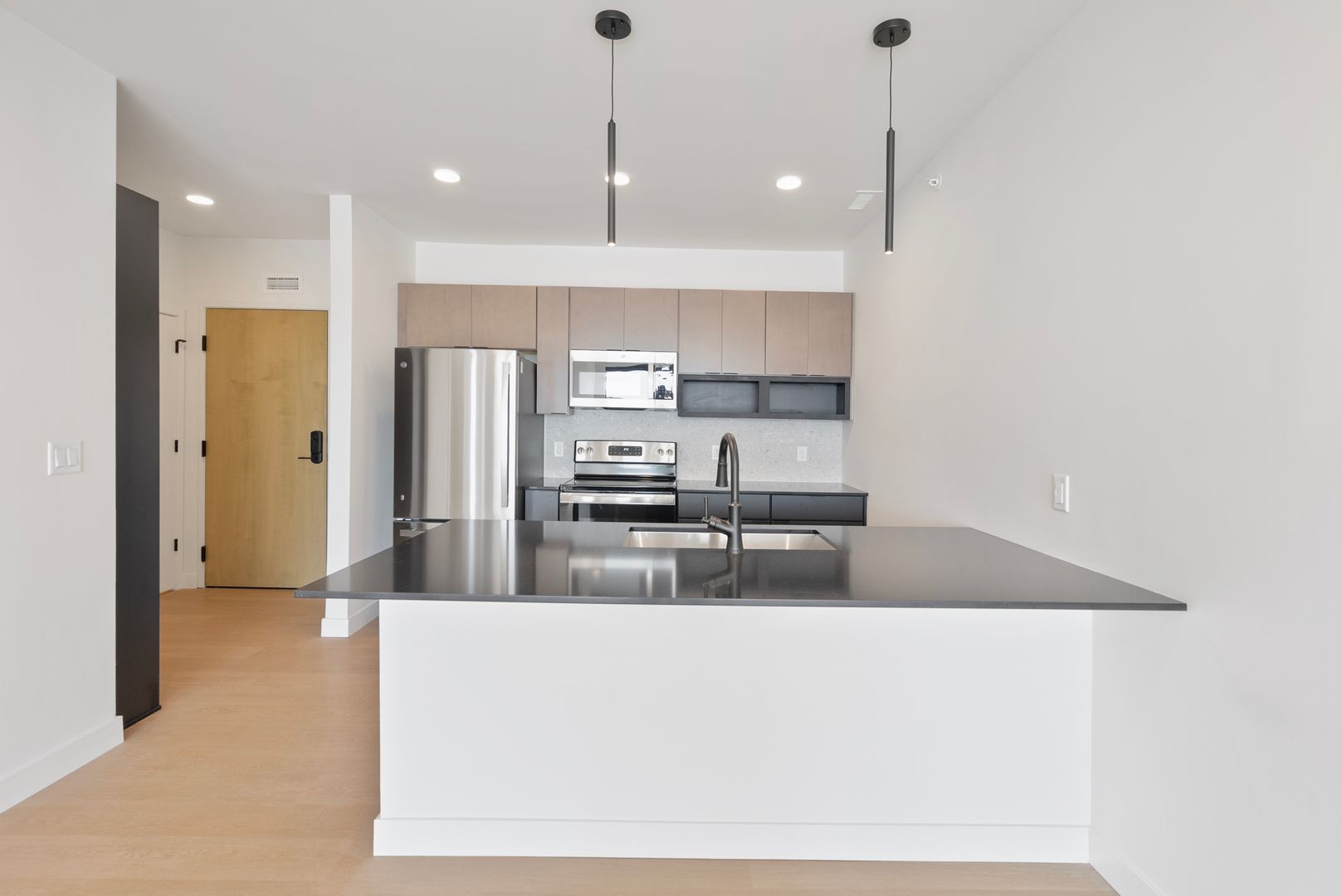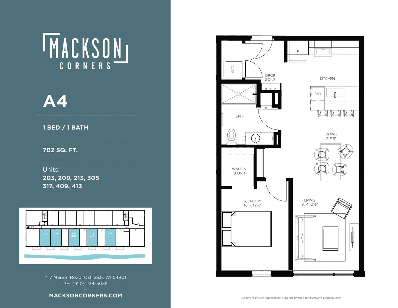 This is a 1 bedroom, 1 bathroom unit in Mackson Corners, a 4-story residential development located at 417 Marion Road in Oshkosh, WI, directly on the Fox River. The building includes 74 residential units of various sizes, including furnished and unfurnished studios, one-bedroom units, and two-bedroom units. Features like the river-facing fitness center and walk-up residential units connect the building to the surrounding neighborhood, encouraging pedestrians to flow through the site to the river. There is also ample space for gathering on site including a first-floor lounge & rooftop terrace. The building has both underground, heated parking and surface parking.